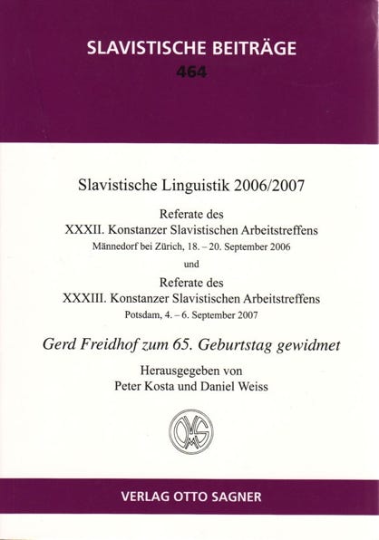 Bibl. Angabe: P. Kosta, D. Weiss (Hg.): Slavistische Linguistik 2006/2007. Referate des XXXII. Konstanzer Slavistischen Arbeitstreffens Männedorf bei Zürich, 18.-20. September 2006, und Referate des XXXIII. Konstanzer Slavistischen Arbeitstreffens Potsdam, 4.-6. September 2007. Gerd Freidhof zum 65. Geburtstag gewidmet (= Slavistische Beiträge Bd. 464). München 2008.